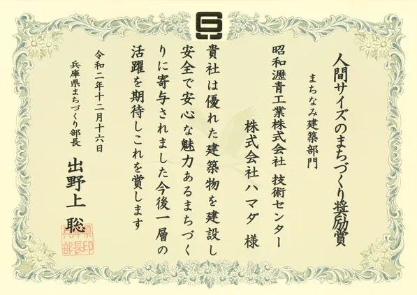 兵庫県「人間サイズのまちづくり賞」まちなみ建築部門奨励賞を受賞しました。